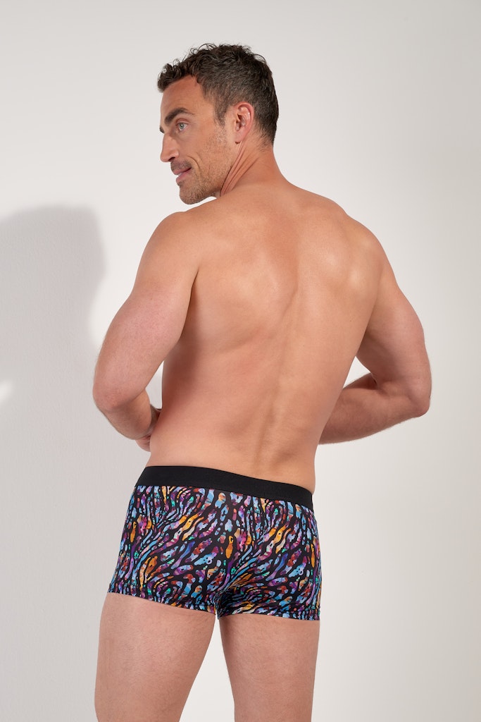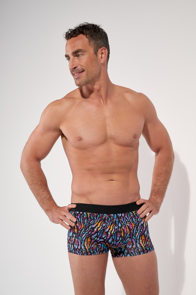 These boxer briefs in stretch microfiber feature a short cut at the top of the thighs and a seamless waistband. Their colorful animal print displays a bold tropical style inspired by Miami.Materials + Care