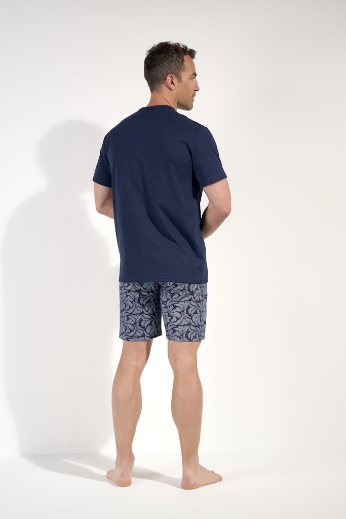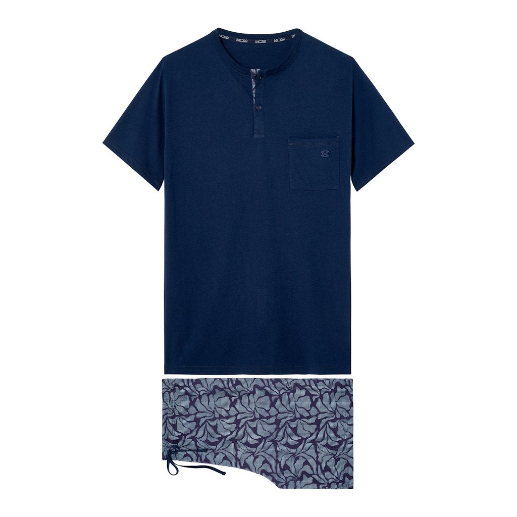 The Long Island Short Pajama Set exudes an elegant, relaxed charm. Made from 100% cotton, they are light and soft, providing natural breathability throughout the night. This set consists of two pieces: shorts with a refined floral pattern and a plain short-sleeved T-shirt. The print features large flowers with petals printed with a Prince of Wales pattern in shades of light blue on a navy blue background. The plain midnight blue T-shirt has a Tunisian collar with HOM engraved buttons and a patch pocket with embroidery.Materials + Care