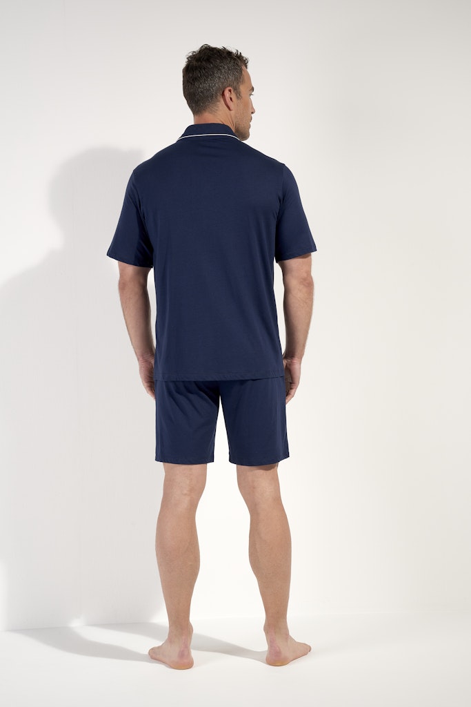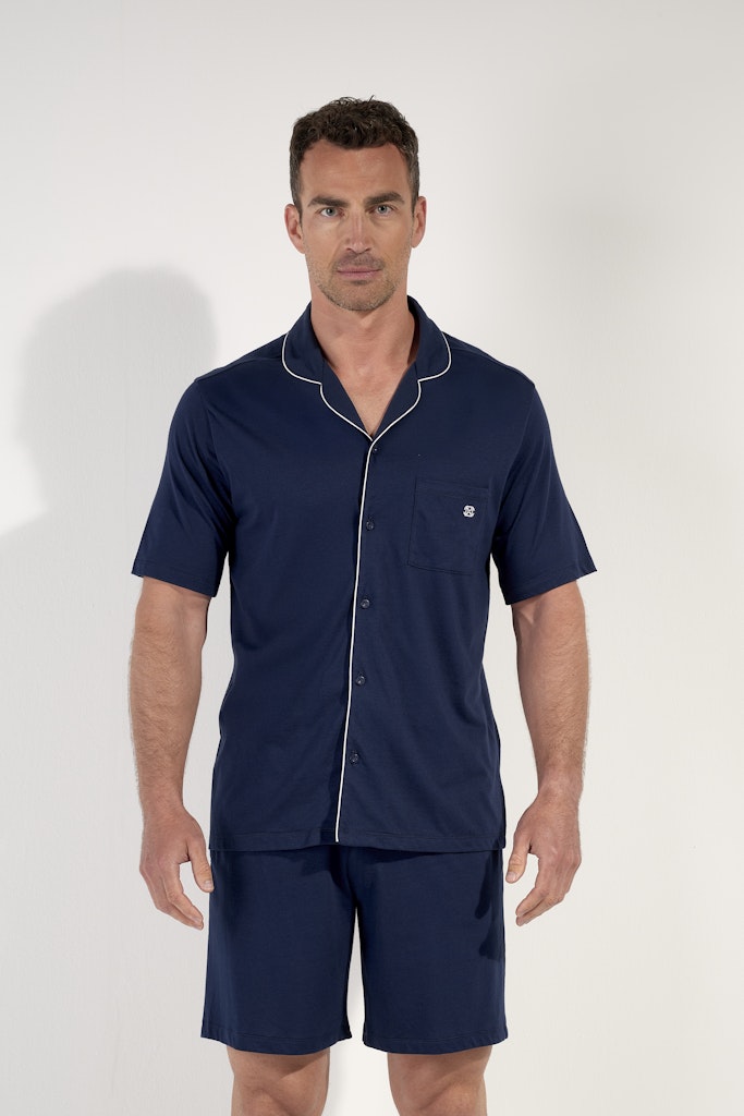 The Rafael men's short pajama set embodies the relaxed elegance of HOM. This 2-piece set combines shorts with a short-sleeved shirt, buttoned at the front with HOM engraved buttons. The deep midnight blue color, enhanced by contrasting piping and an embroidered patch pocket, adds a subtle touch of sophistication. Both breathable and comfortable against the skin, these pajamas are perfect for sleeping or relaxing in style.
