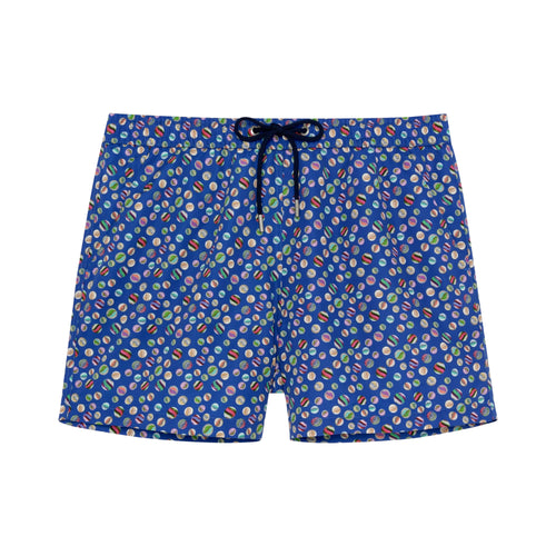 The SOCOA beach boxer is a swim boxer with a loose, straight, medium-length thigh-high cut. Thanks to this comfortable design, you can adopt a chic casual look to feel comfortable in any circumstance. Support is provided by a mesh brief lining and a drawstring waist with branded metal ends. Practical and functional, the beach boxer shorts have two side pockets and a back welt pocket with Velcro fastening. These beach boxer shorts are made from high-quality polyester. This fabric is resistant to chlorine or salt water, won't crease and respects the intensity of colors. It's ideal for making the most of your summer, with plenty of swimming in the sea or in the pool. Tastefully designed by our designers, the beach boxers are decorated with figurative drawings of colored marbles on a blue background. This summery, colorful print makes them an elegant, stylish piece of swimwear for all looking for comfort and originality. All our beach boxers are OEKO-TEX® certified, a guarantee of the quality of the materials used and respect for the sensitivity of the skin.Materials + Care